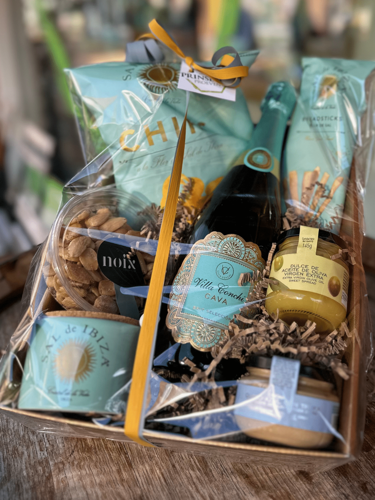 De elegante Cava Villa Conchi vormt het bruisende middelpunt van dit pakket. Deze Spaanse mousserende wijn past perfect bij de delicatessen van Sal de Ibiza: knapperige chips, ambachtelijke breadsticks en het kenmerkende zeezout in keramiek. De smaakmakers – zoals de citroen-olijvenspread, blauwekaas-paté met truffel en vers gebrande amandelen van NOIX – zorgen voor een heerlijk zomerse borrelervaring.
